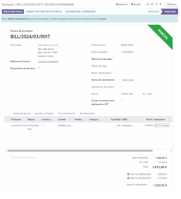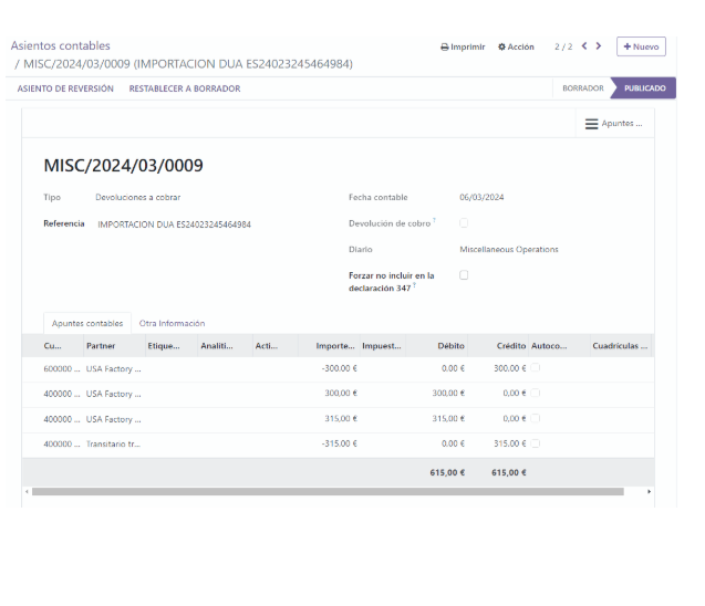 NOTA: Si creamos esta factura como proveedor con posición fiscal “Importador con DUA” a nombre del transitario, nos “ahorraremos” el paso final de traspasar los 315 € de IVA pagados al transitario.
