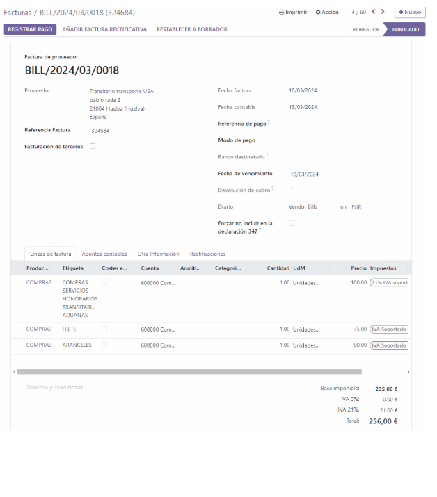 Creamos una factura de proveedor a nombre del transitario incluyendo únicamente los conceptos con IVA o exentos.